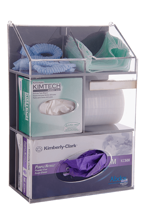 The workstation bin features three main sections: - The first section accommodates tubes, vials, pipette tips, masks, or hair caps. - The second section stores and dispenses tissue papers, Kimwipes, or Parafilm M with an integrated serrated blade for easy tearing. - The third section provides convenient access for gloves or other disposable items.